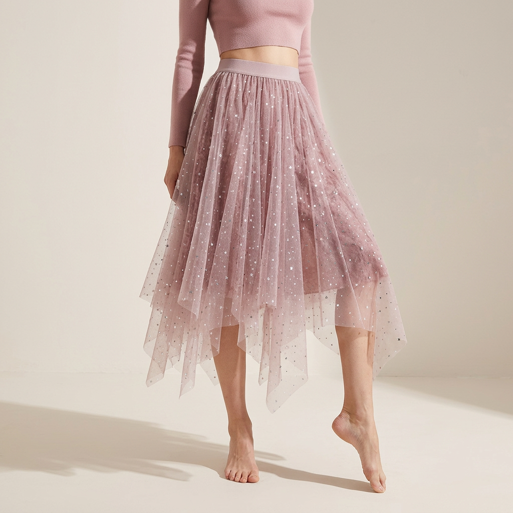 Fluffy Star Sequin Irregular Mesh And Velvet Skirt - 0310_PINK