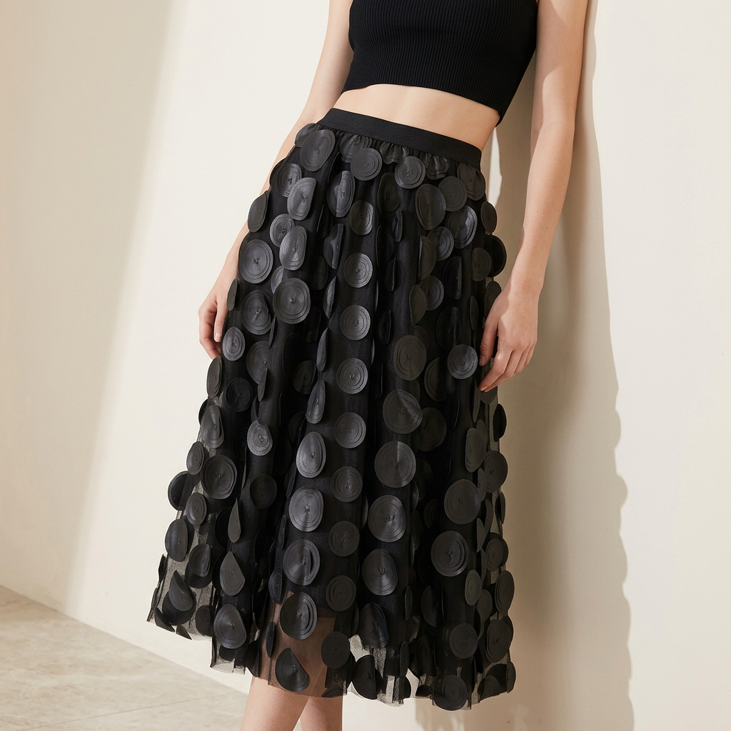 Polka Dot Hepburn Style Umbrella Mesh Skirt - 0931_BLACK - 24